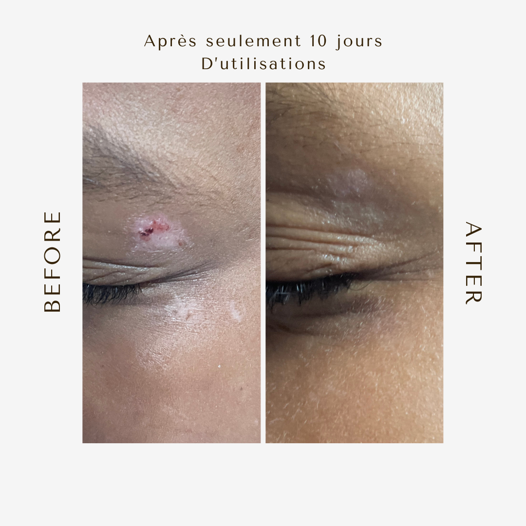 Les premières améliorations (apaisement, réduction des rougeurs, diminution des tiraillements) apparaissent dès 7 à 14 jours. La peau commence ensuite à se réparer en profondeur : texture plus lisse, taches atténuées, teint uniforme.